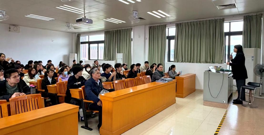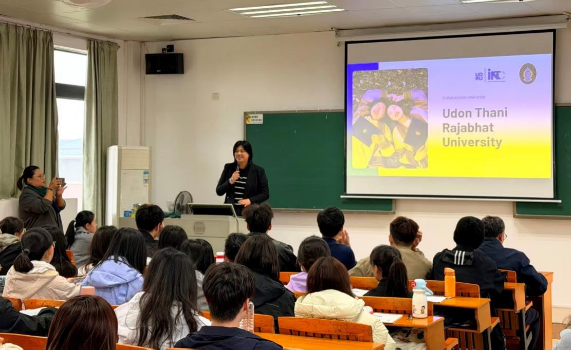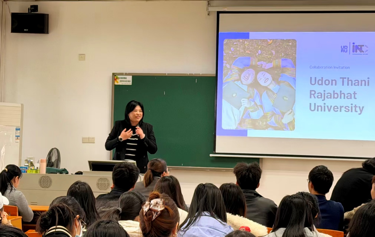 SAWITREE BOONMEE教授全程以英文演讲,她系统介绍了UDRU的办学历史、校园概貌及“国际学院(INTC)”的办学特色:包括全英文授课的本科与硕士项目、双向交换与短期游学、沉浸式泰国文化体验,以及“全球—本地双向赋能”的发展理念。她强调,UDRU正通过“把全球知识带进地方、把地方智慧推向世界”的战略合作框架,与东盟、欧盟及中国高校共建应用型人才培养生态圈,她热忱欢迎新华学子赴泰攻读双学位、参与科研实训与跨国志愿服务。